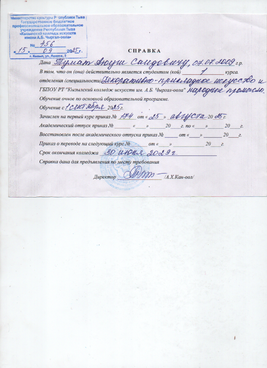 Образование, какое учреждение закончил, специальность, квалификация, год окончания - среднее-специальное, ГБПОУ СПО РТ "Кызылский колледж искусств им. А.Б.Чыргал-оола" 54.02.02 "Декоративно-прикладное искусство и народные промыслы (по видам)": Художественный металл, квалификация художник-мастер, преподаватель, год окончания 2020г.