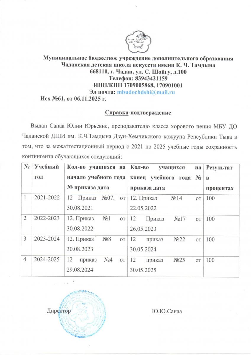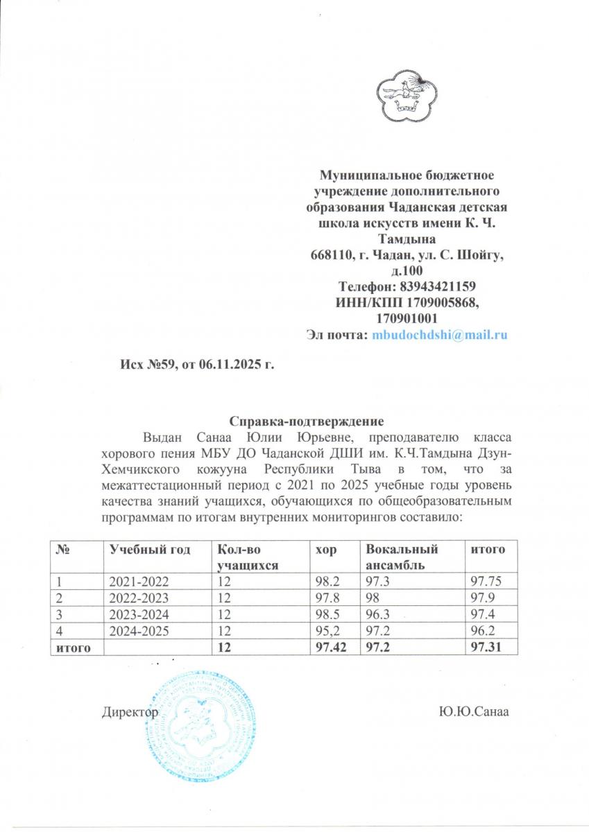 ссылка на персональную страницу педагогического работника\официальный сайт образовательной организации Аттестационные материалы преподавателя хорового класса Санаа Юлии Юрьевны - МБУ ДО «Чаданская детская школа искусств имени К. Ч. Тамдына»